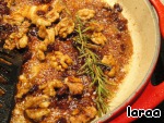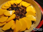 Форму снять с огня. Розмарин удалить. Тыкву выложить поверх орехов с изюмом. Немного присолить.