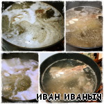 И еще два раза такую процедуру повторим. Снимая пену и добавляя немного воды. Бульон станет практически прозрачным и чистым.