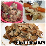 Вынимаем из кастрюли мясо и коренья. Коренья вываренные - в помойку, а мясо мелко режем. И тоже пока в сторонку.