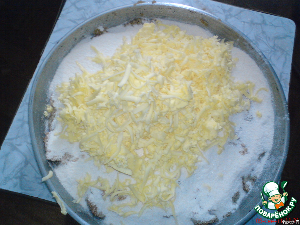 Посыпьте тертым маргарином и выпекайте при 180 град., примерно 40 минут.