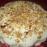Взбить сливки с сахаром (или сметану с сахаром), намазать сверху на остывший сметанник, сверху посыпать орехами.