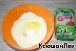 Сделать углубление, добавить в него яйцо, сахар, соль и воду