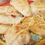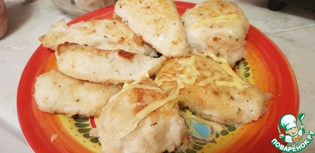 Вымыть куриные грудки, порезать на кусочки как вам нравится и чуть отбить (у меня куда-то делать колотушка, поэтому я отбивала ручкой ножа). В миску или пиалу разбить яйцо и смешать его с майонезом или сметаной (но тогда чуть посолить), затем насыпать муку на тарелочку. Взять отбитые кусочки грудки, обвалять их сначала в яйце с майонезом, а потом в муке, и выложить их на разогретую сковородку, сбрызнутую маслом. Посыпать чесночком и обжарить с двух сторон до готовности, примерно 15 мин. Выключить плиту и присыпать тертым сыром, пока горячие. Подавать можно как с гарниром, так и холодные на бутербродах (лучше всякой колбасы). Мы любим и так, и так. Приятного аппетита!