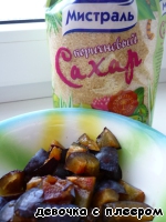Из слив вынуть косточки, нарезать небольшими кусочками (примерно средняя слива на 4 части). Посыпать сливы немножко коричневым сахаром. |