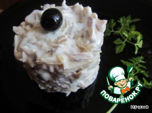 Заправить майонезом. Украсить зеленью, маслинами или свежим огурцом.