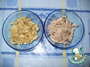 - Курица (куриное филе отварное или жареное, по кол-ву, столько же, сколько и грибов )