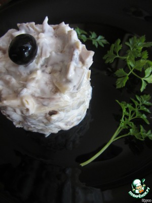 Заправить майонезом. Украсить зеленью, маслинами или свежим огурцом.