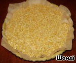 Смешать все с помощью ножа. Тесто вымешать быстро руками, пока оно не станет гладким. Слепить из рубленого теста шар, завернуть его в плёнку и оставить в холодильнике на час. Раскатать тесто, навернуть его на скалку и снова раскатать поверх смазанной жиром формы, несколько раз проткнуть корж вилкой, положить сверху пергаментную бумагу и равномерно утяжелить ее сухим горохом. Выпекать около 15 минут до полуготовности при температуре 200 градусов.