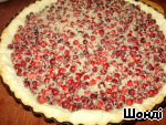 Корж смазать облепиховым джемом. Выложить бруснику с коричневым сахаром.