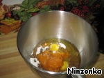 Делаем в этой смеси углубление и кладем туда яйца, пюре тыквы, масло и мед.