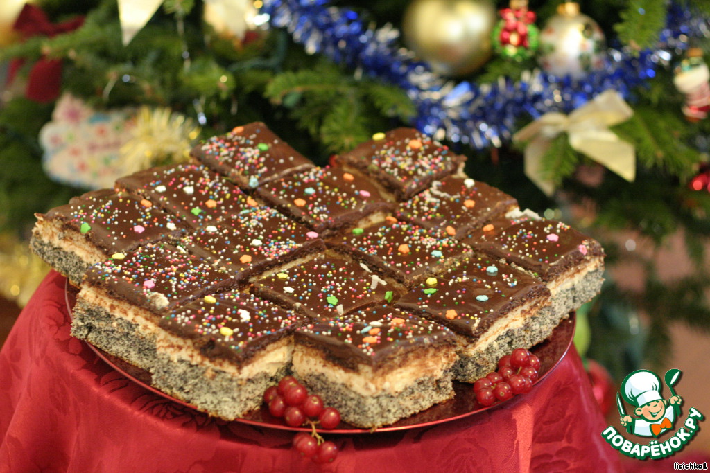 • Этот пляцок состоит из двух коржей и крема - бисквитный корж, маковый корж и сливочный крем.