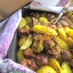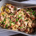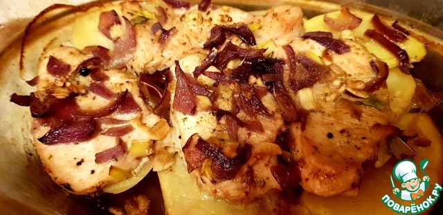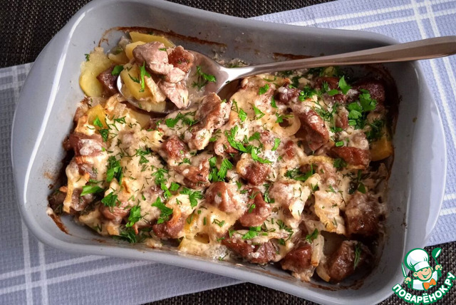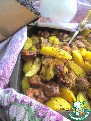 3. Выложить в форму для духовки слоями - картошку, мясо и сверху я кладу все, что было с мясом - весь лук и маринад. Запекать примерно при 300 гр. около часа.