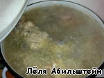 Когда содержимое бачка закипит, снимаем пену, уменьшаем огонь до минимума, чтобы только немного булькало и продолжаем варить под крышкой 8 часов. За час до готовности солим, кладем лаврушку, перец и лук. Выключаем огонь, оставляем остывать.