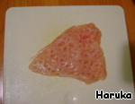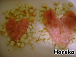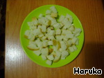 Нарезать небольшими кубиками батон. На фото для одного кусочка батон.