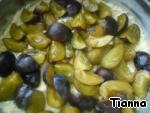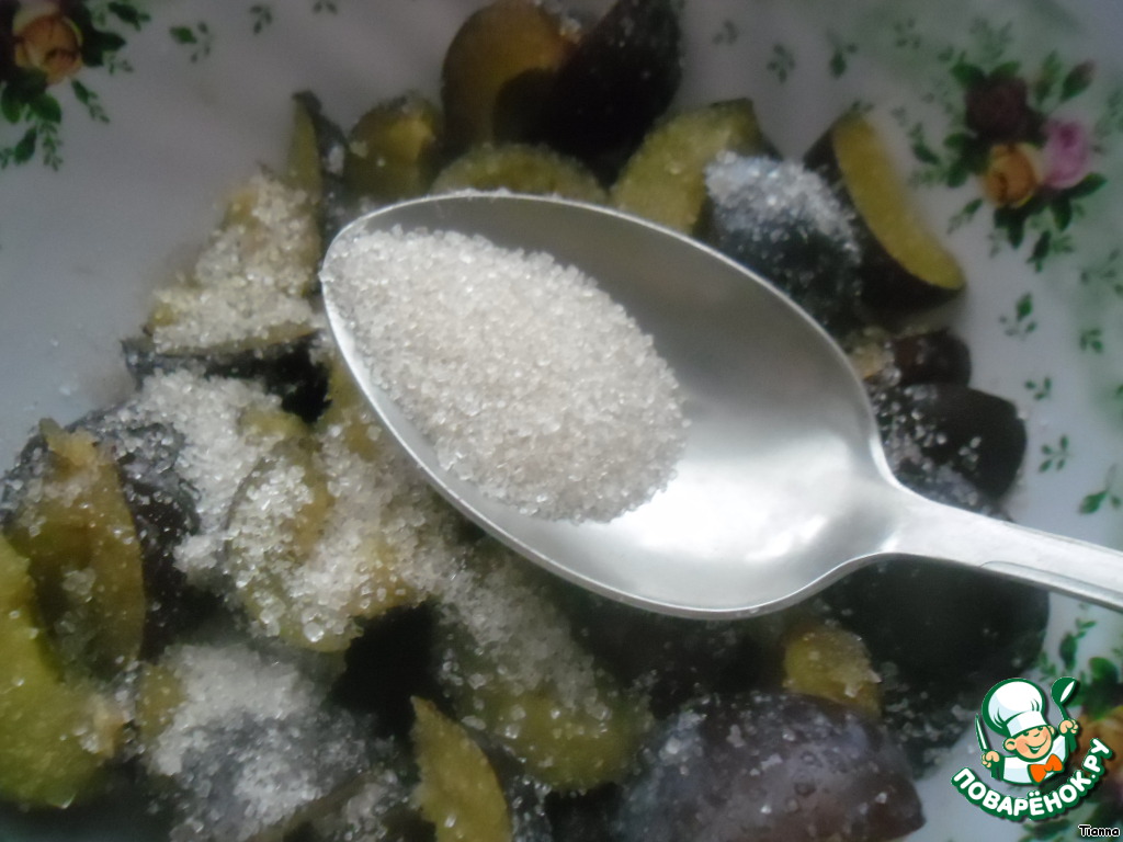 Сливы разрезать на 4 части, посыпать сахаром (1 ст.л.) и полить вином. Перемешать и оставить на 30 минут в прохладном месте.