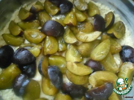 Форму смазать маслом и выложить туда часть теста. Поверх разложить сливы.