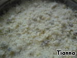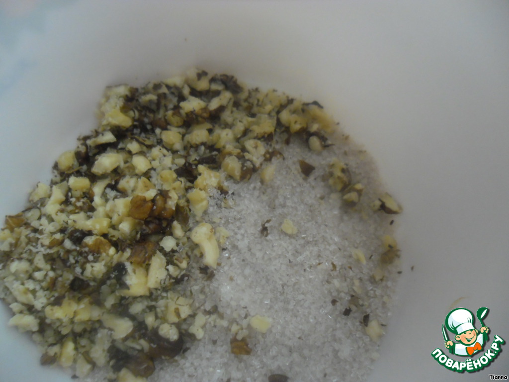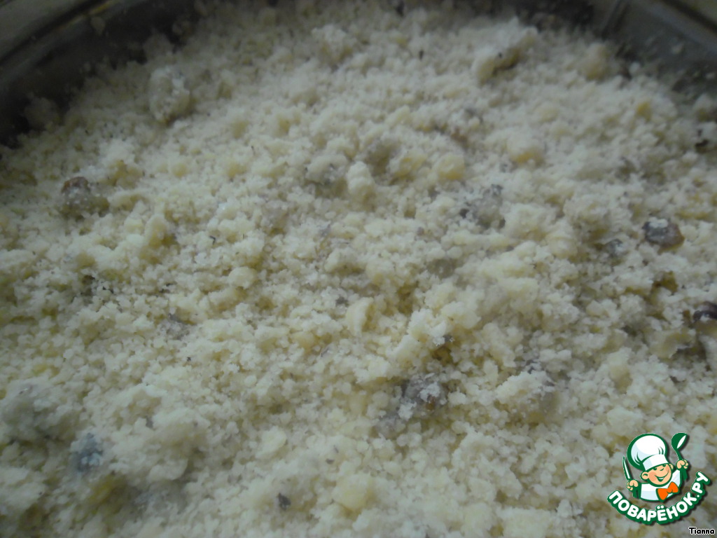 Орехи измельчить, смешать с сахаром (1,5 ст.л) и мукой (80 г). Добавить масло и растереть все в крошку.