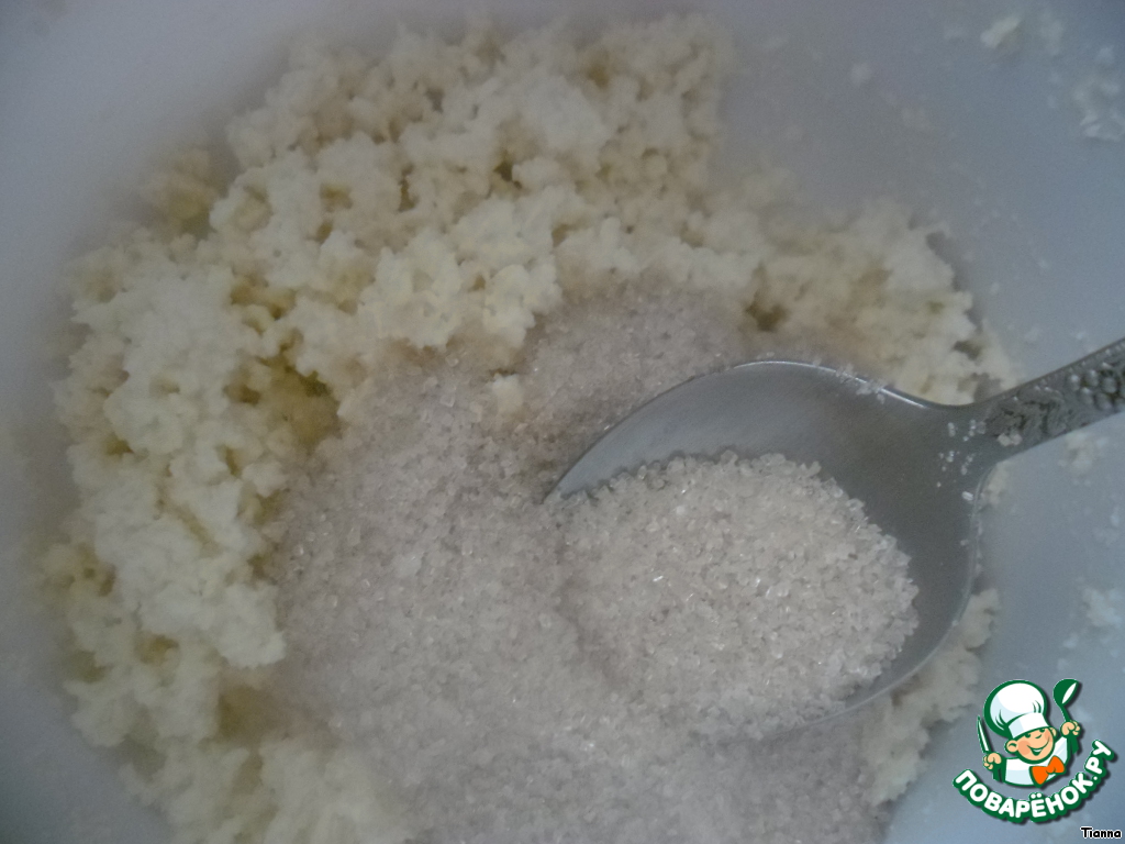 Творог растереть с оставшимся сахаром. Добавить яйца и эссенцию и взбить при помощи миксера. Слить со слив жидкость и добавить к творогу. Муку смешать с разрыхлителем, всыпать ее в творожную массу и тщательно перемешать.
