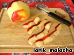 Теперь начинка: яблоки помыть и ножом-экономом нарезать полоски с небольшой полоской кожицы.