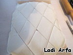 Купила 0,5 кг слоёного теста, раскатала на бумаге для выпечки (что очень удобно), нарезала ромбами. -
