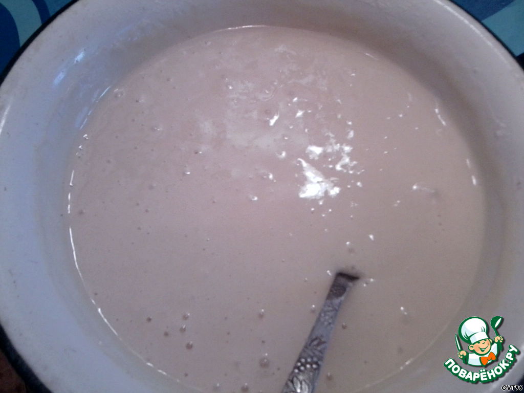 Сахар слегка взбить с яйцами, добавить гашеную соду и перемешать. Всыпать муку и хорошенько перемешать. Тесто должно быть по густоте, как сметана.