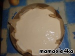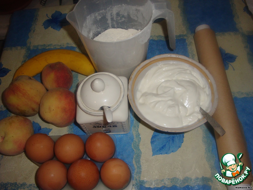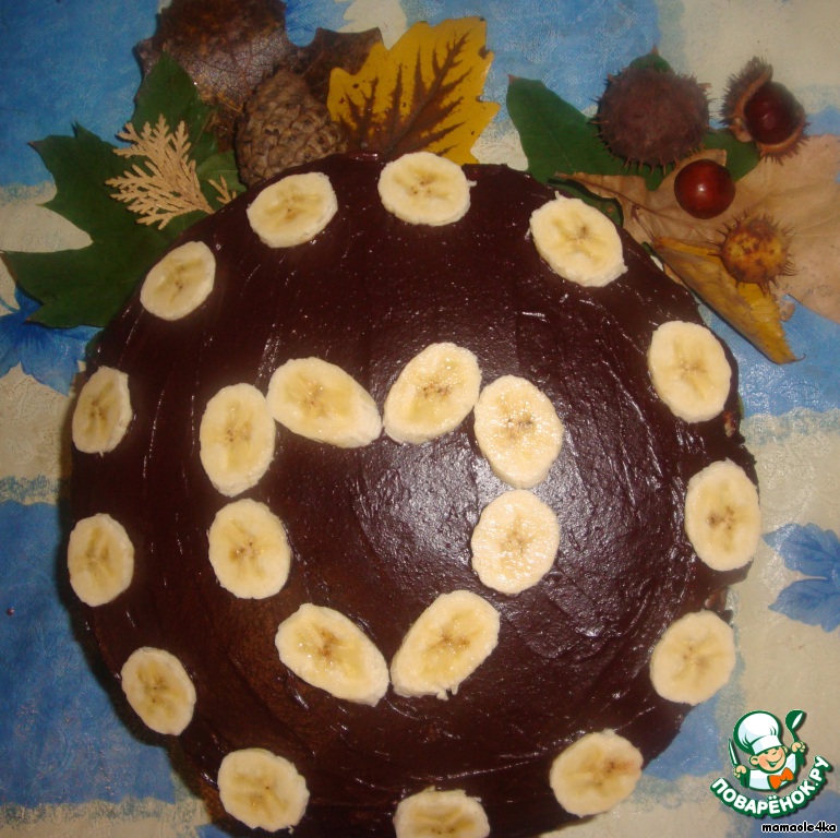 • На нижний бисквит выкладываем сметанный крем. Сверху выкладываем нарезаный персик или другой, вами любимый фрукт. Накрываем второй половинкой бисквита. Заливаем шоколадной глазурью. Украшаем бананом.