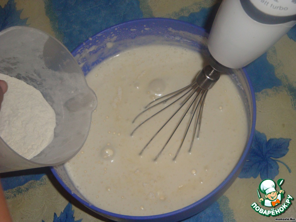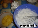 • Белки отделить от желтков. Взбить белки миксером в густую пену. Добавлять в пену по одному желтки. Постепенно всыпать сахар.