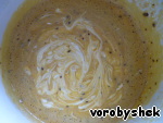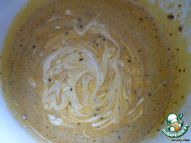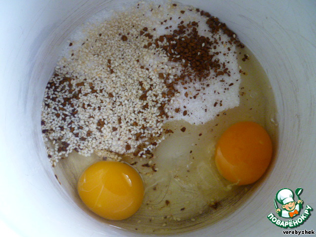 Смешать яйца с сахаром, солью, кофе и кунжутом.