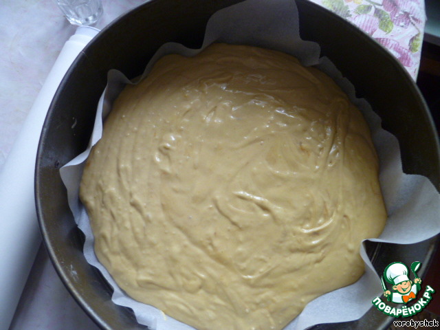 Вылить тесто в форму с пергаментом. Поставить в предварительно разогретую духовку и выпекать 30 минут при 180 градусах, 10 минут при 200 градусах.