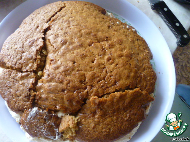 Сверху накрыть верхней половиной коржа (прошу прощения за поломанный корж, дочке очень хотелось тортика, и пока мама отвернулась, она начала его ломать и кушать).