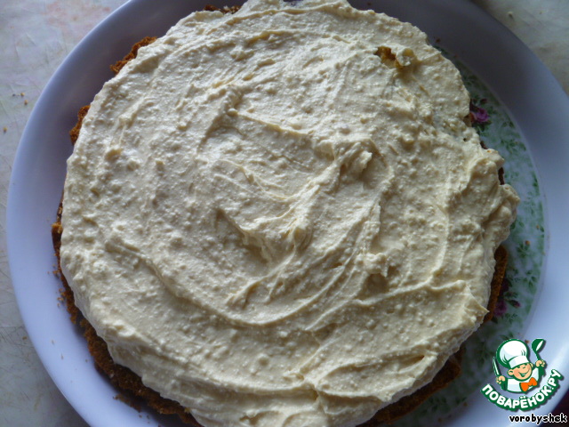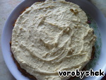На нижний корж выложить половину крема и хорошо разровнять.