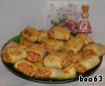 У нас только недавно начали продавать слоeное тесто.... Я от него в восторге... Идею таких пирожков я подсмотрела в интернете. Автора, к сожалению, не знаю, но хочу сказать ему огромадное СПАСИБО! Добавила немного "отсебятины"... И получились, действительно, вкусные, нежные пирожки на "один зубОк"....