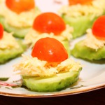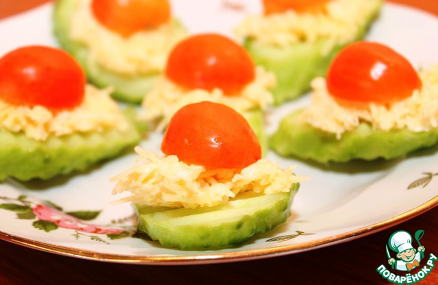 Намазать сырной массой кружки огурца и сверху каждого положить по половинке помидорчика черри. Ешьте на здоровье!
