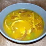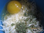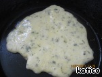 Пока суп закипает, приготовим чесночный омлет: соединить вместе яйцо, тертый сыр и 0,5 чайной ложки густой сметаны, хорошо размешать, добавить сухую зелень и перец,