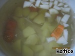 В кипящую воду бросить лук, морковь, картофель, пусть поварятся немного,