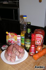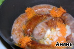 Я покупала несколько видов колбасок: куриные, из телятины и из свинины. Колбаски нужно обжарить на подсолнечном масле, затем добавить к ним тертую морковь и нашинкованный лук. Обжарить до золотистого цвета.
