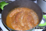 Затем добавить пиво, чтобы покрывало колбаски, кетчуп чили, перец, горчицу, соль по вкусу. Тушить на медленном огне 20 - 30 мин.