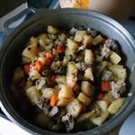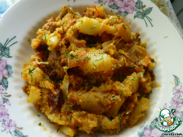 Это рагу с мясом, картофелем, капустой, морковью и луком. Оно универсальное, так как можно менять ингредиенты или добавлять, да и мясо можно брать совершенно разное. А главное - сытно, вкусно и просто.