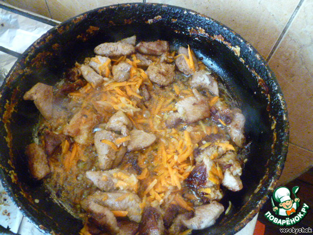 Мясо нарезать небольшими кусочками и обжарить на растительном масле вместе с одной мелко нарезанной луковицей и 1 морковью, натертой на терке. Посолить.