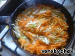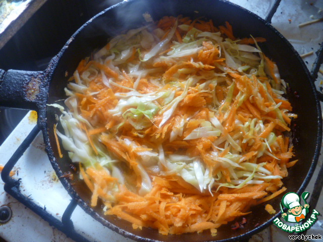 Нашинковать капусту и пожарить ее на сковороде с растительным маслом. Добавить 1 мелко нарезанную луковицу и морковь, натертую на терке. Посолить по вкусу. Довести до готовности.