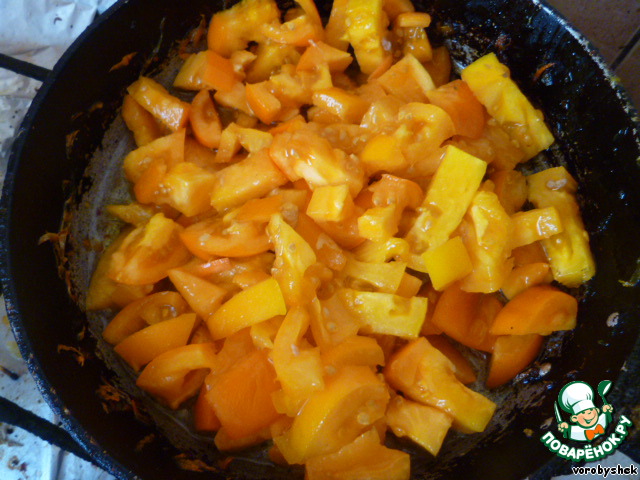Порезать небольшими кусочками помидоры и потушить их на сковороде до мягкости.
