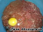 Сначала подготовим домашний фарш. Пропустим мясо через мясорубку с луком. Затем добавим в фарш яйцо.