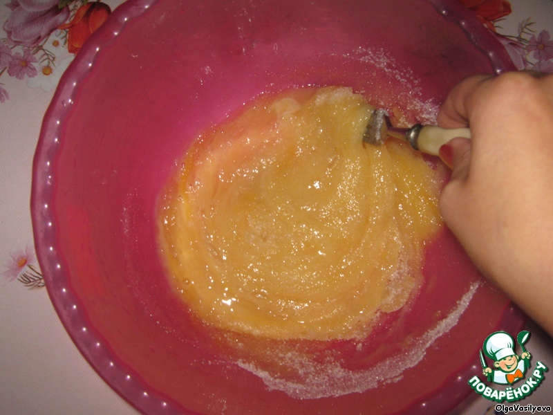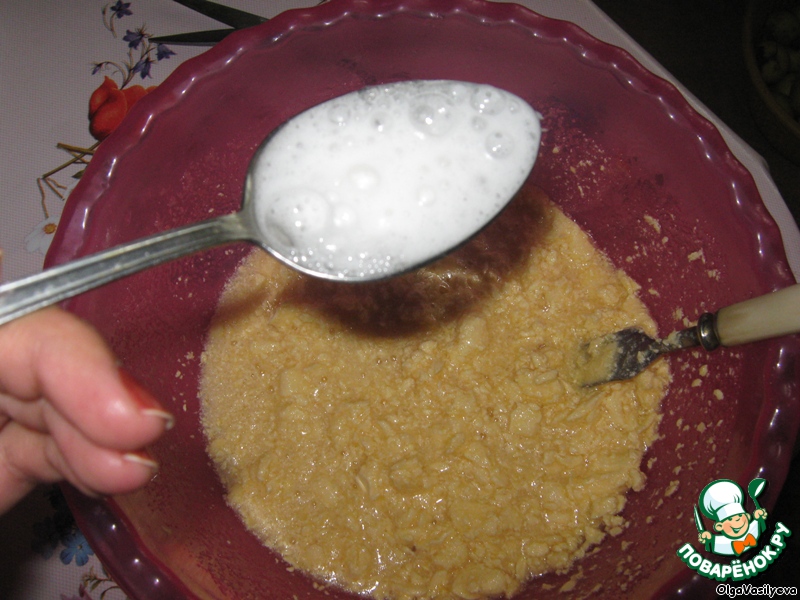 Все перемешаем, добавляем соду (гашеную) и перемешиваем.