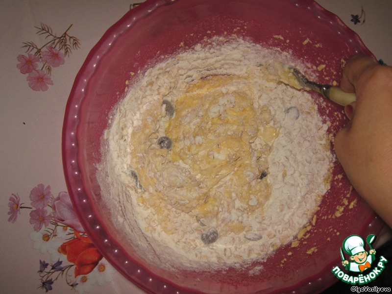 В эту емкость добавляем смесь из муки, овсянки и перемешиваем...