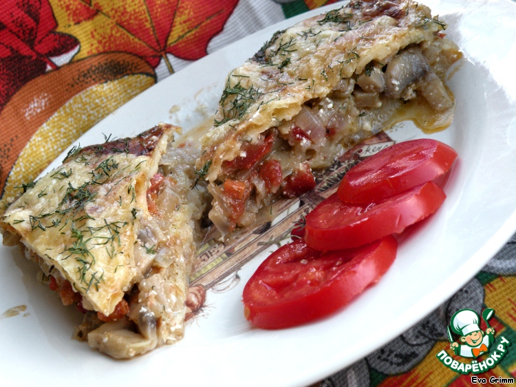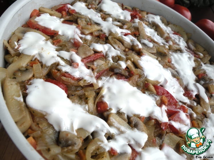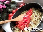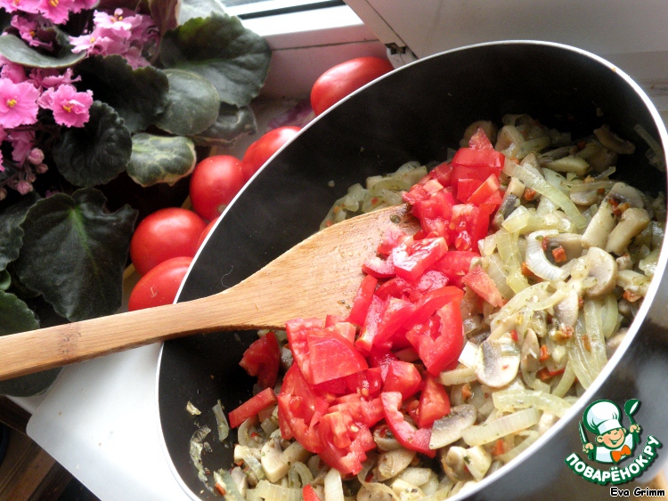 Пережарим (и потушим под крышкой до мягкости) на ложке масла грибы и лук, после добавим свежие помидорки и перемешаем