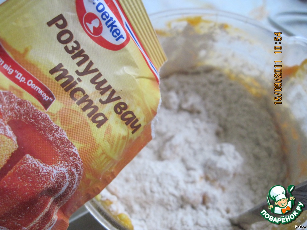 В смесь добавляем муку с разрыхлителем (у меня ушло 2,5 стакана)