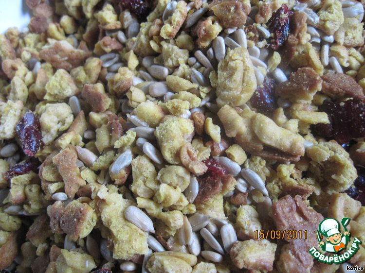 Готовую крошку остудить, повторяю, она должна быть полностью сухой, добавить в нее сушеную клюкву, орехи, нарезанный чернослив (предварительно запарить и высушить) и ядро подсолнечника