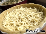 Выкладываем тесто в форму (предварительно смазать маслом), посыпаем половиной сыра