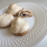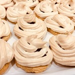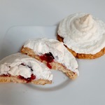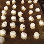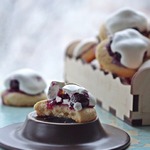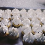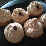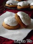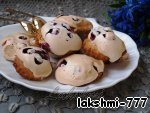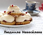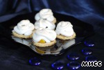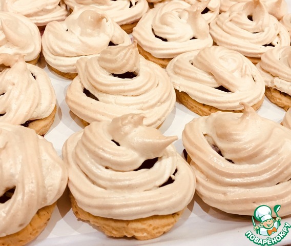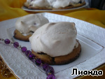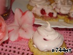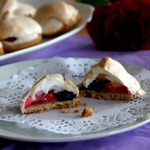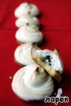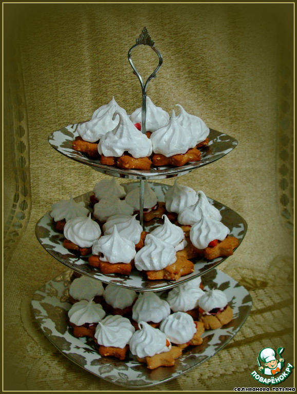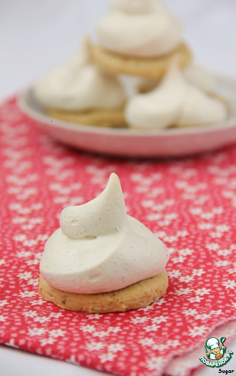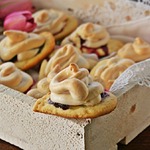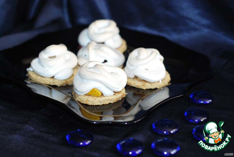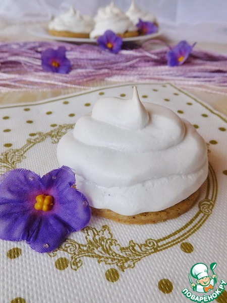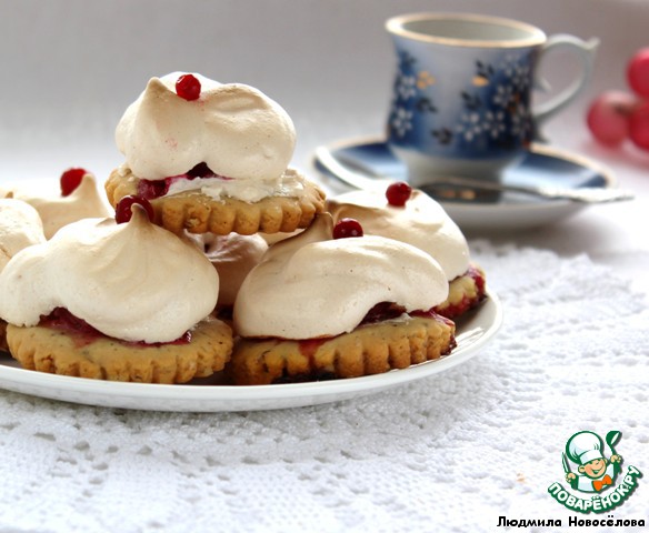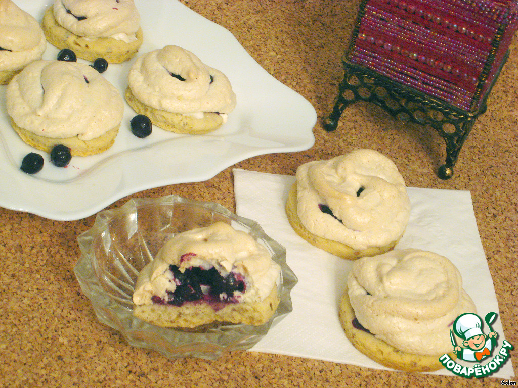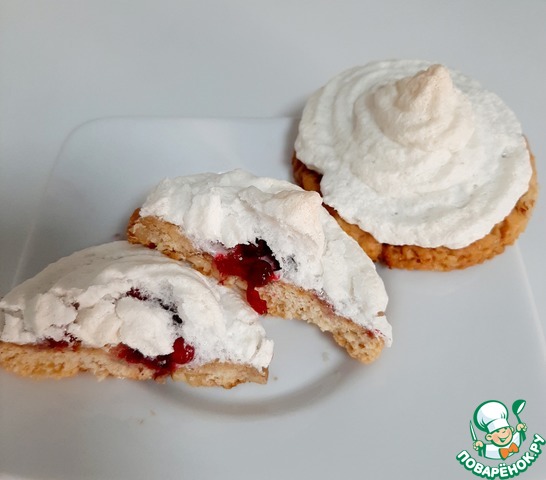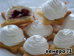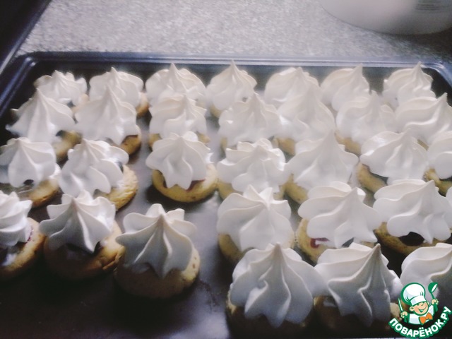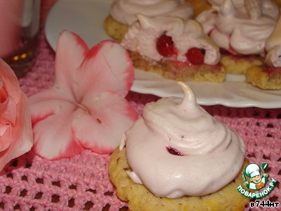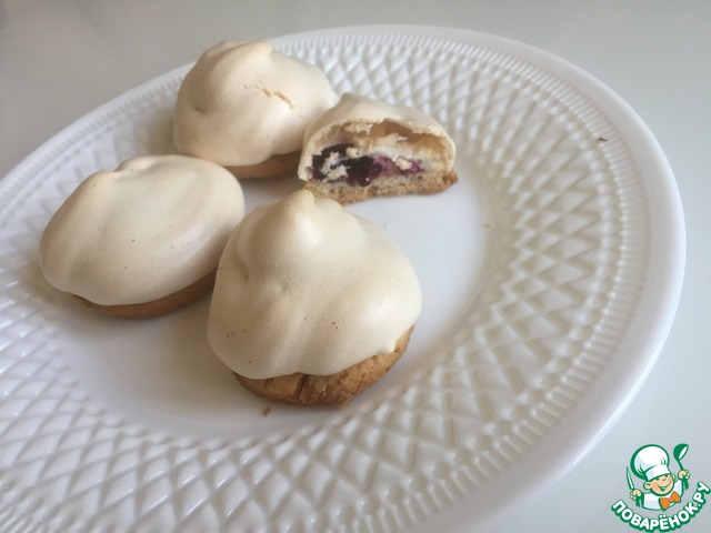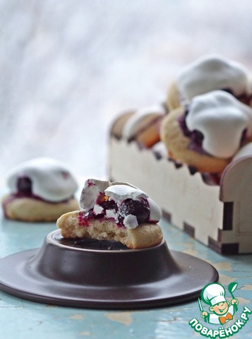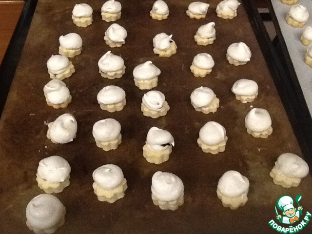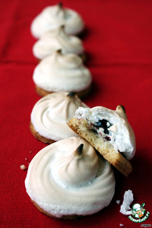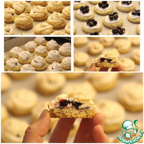 Достаем заготовки из духовки, немного смазываем каждую белковой пеной для того, чтобы с них не скатывались ягоды, на каждую заготовку кладем по 3-4 ягодки и отсаживаем сверху белки из кондитерского мешка. Отправляем снова в духовку под гриль на 5 минут до легкого румянца, затем температуру снижаем до 110 градусов, переводим духовку на нижний режим и готовим сабле еще 30 минут.
