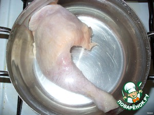 Куски курицы залить водой и поставить вариться, когда закипит - посолить, снять пену и варить на маленьком огне 40 минут.